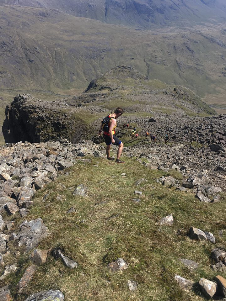 Soon after the checkpoint we crossed the road again. The Dreaming of the fells support crew were there to meet us offering supplies, support and encouragement. We began the long trek from Dunmail to Scafell Pike via Angle Tarn. For us this was a three hour long undulating run across open moorland. Offering only a few paths to follow and little shade. We were rewarded with fabulous views, scenery and even patches of snow high on the mountains. The climb to Scafell Pike was complicated by the number of walkers, attracted by the warm weather, who were scurrying up and down the mountain like a swarm of ants. There were no tourists on the extremely steep downhill to a nice shallow stream in which we could cool our feet.